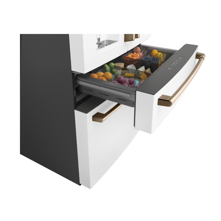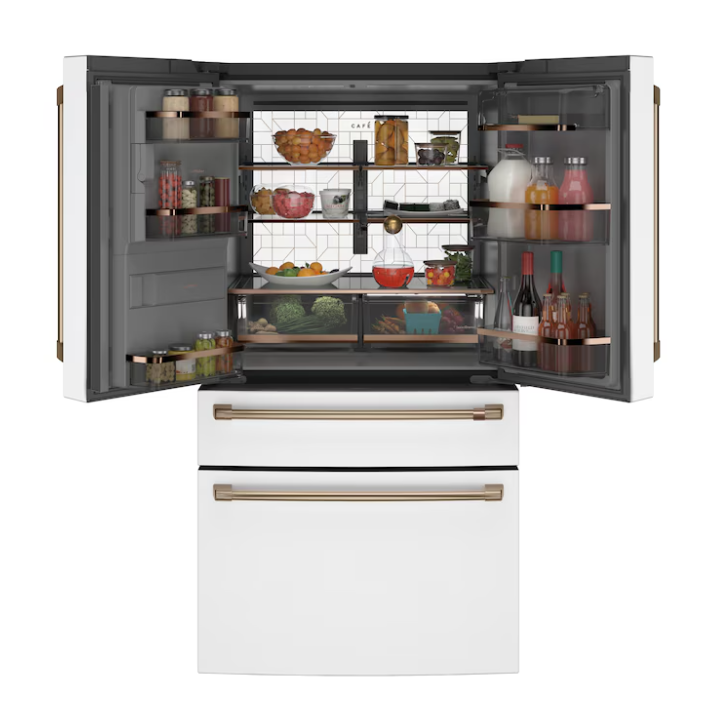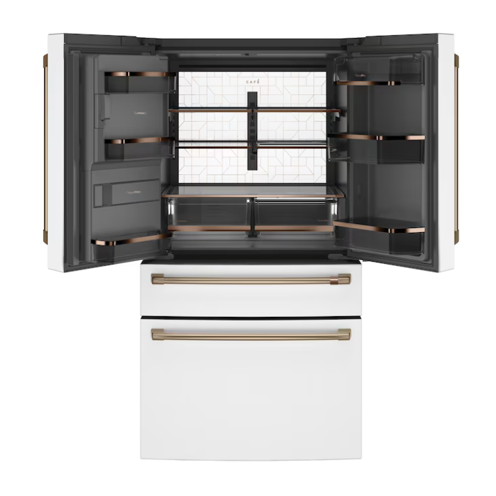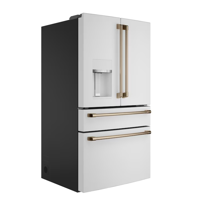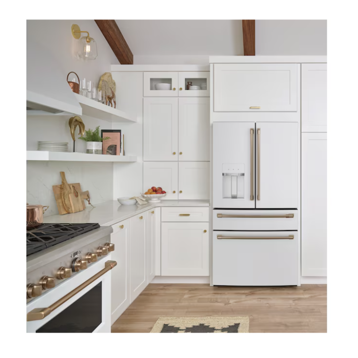 Cafe Standard-Depth 27.8-cu ft 4 -Door 36-in Wide Smart Compatible French Door Refrigerator with Ice Maker with Water and Ice Dispenser (Matte White with Brushed Bronze Handles) ENERGY STAR Certified