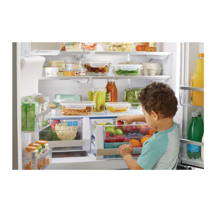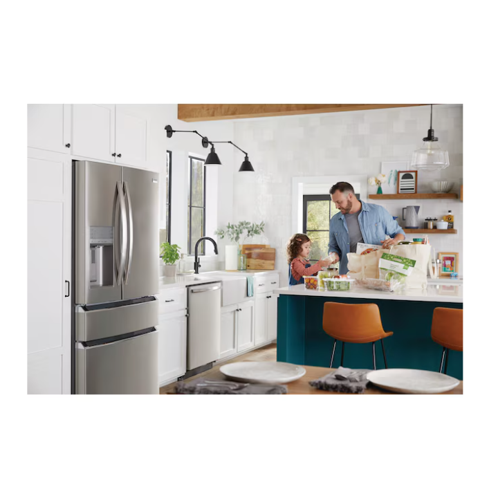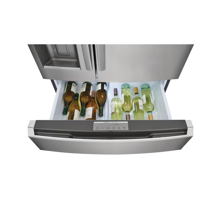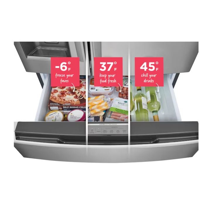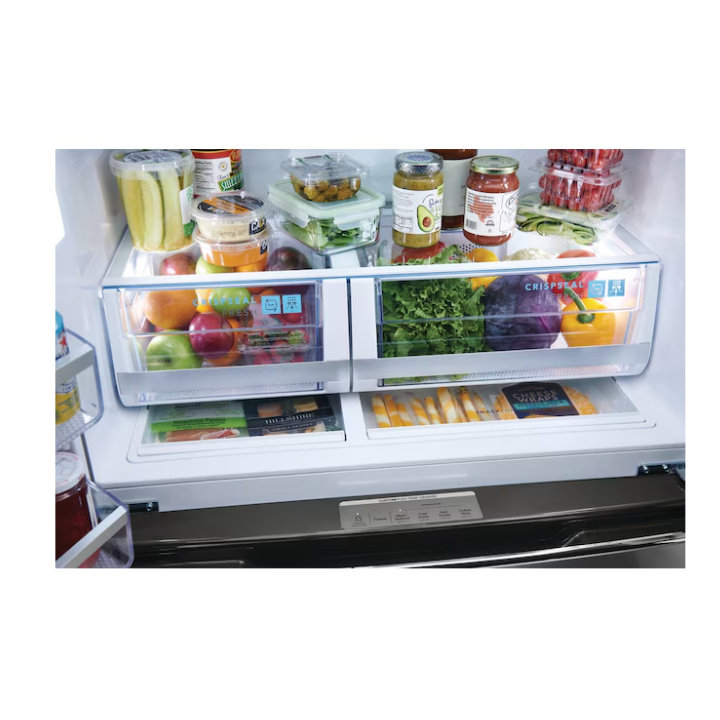 This Frigidaire Gallery French door refrigerator maintains the taste and texture of even your most delicate foods. Lettuce and broccoli stay fresh and crisp for longer in our exclusive CrispSeal® fresh crispers than in any comparable crispers. Our 3 advanced technologies block out dry air, automatically optimize humidity while removing excess moisture, and our built-in antioxidant filter reduces ethylene gas, odors and preserves produce color. Get more storage out of your refrigerator with clever organization solutions that maximize usable space, including in-door condiment storage, a slide-under shelf, a snack zone, a flexible bin which can be used as crisper or an open compartment, and accessory railing system which works with our optional storage pan and wine rack. Get extra space for all your most used items with the custom-flex temp drawer. Store yogurt, beer, or even frozen pizzas with the middle drawer that can be a refrigerator or a freezer. Awarded Editor’s Choice French Door Refrigerator of 2023 by Reviewed.com (USA Today).