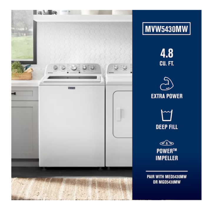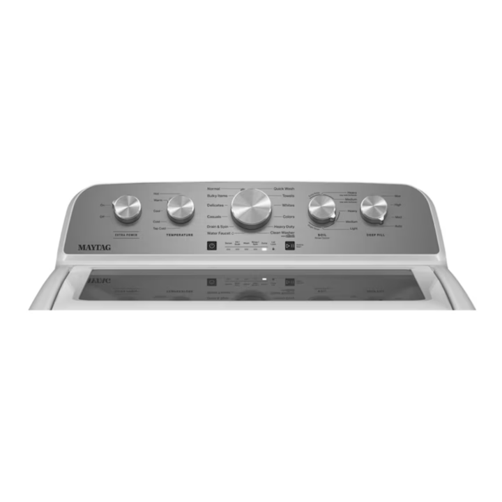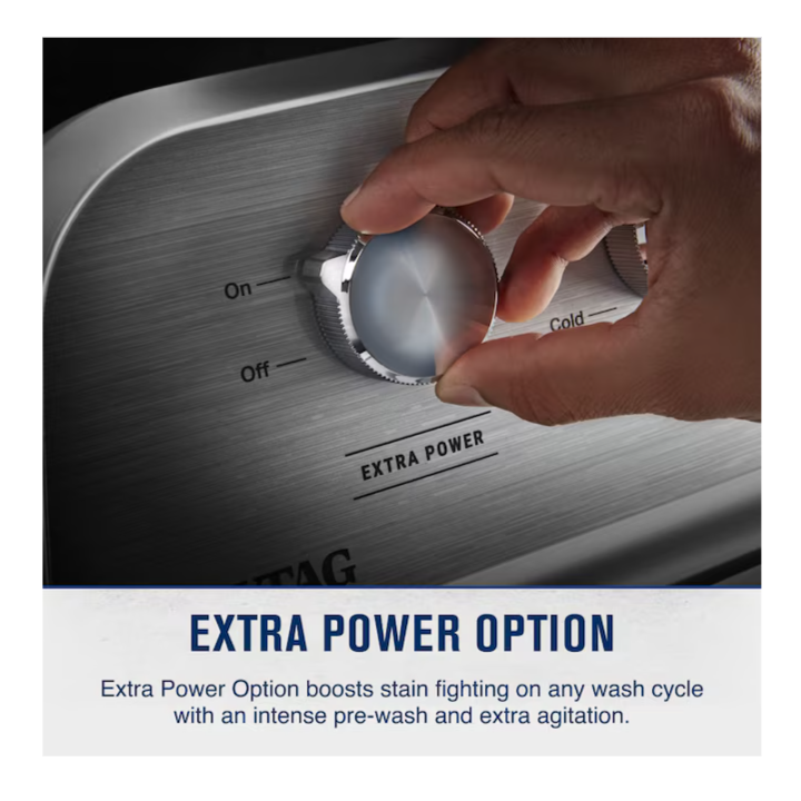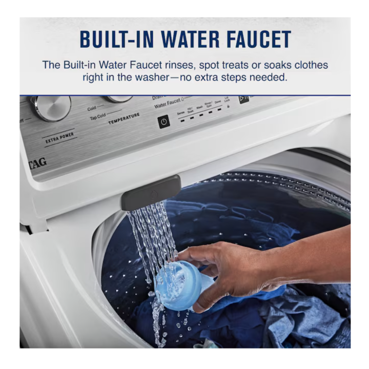 Tap into the power of Extra Power. This Maytag® Top Load Washer features an Extra Power Option that boosts stain fighting on any wash cycle with an intense pre-wash and extra agitation and a Power™ Impeller that helps dissolve soils with a vigorous wash motion. The Deep Fill Option delivers more water to give heavily soiled loads a thorough soak and a Built-in Water Faucet rinses, spot treats or soaks clothes right in the washer—no extra steps needed.
