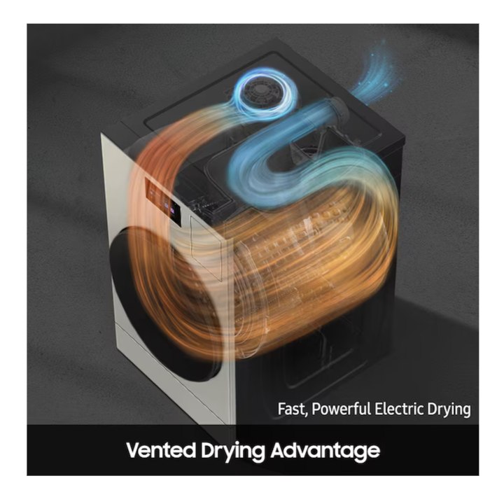 - Vented drying advantage: An internal heater and fan in the vented electric dryer move hot air through clothes and vent out moisture for fast and thorough drying.
