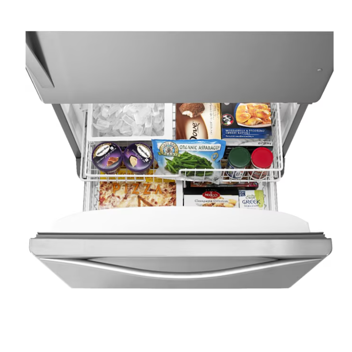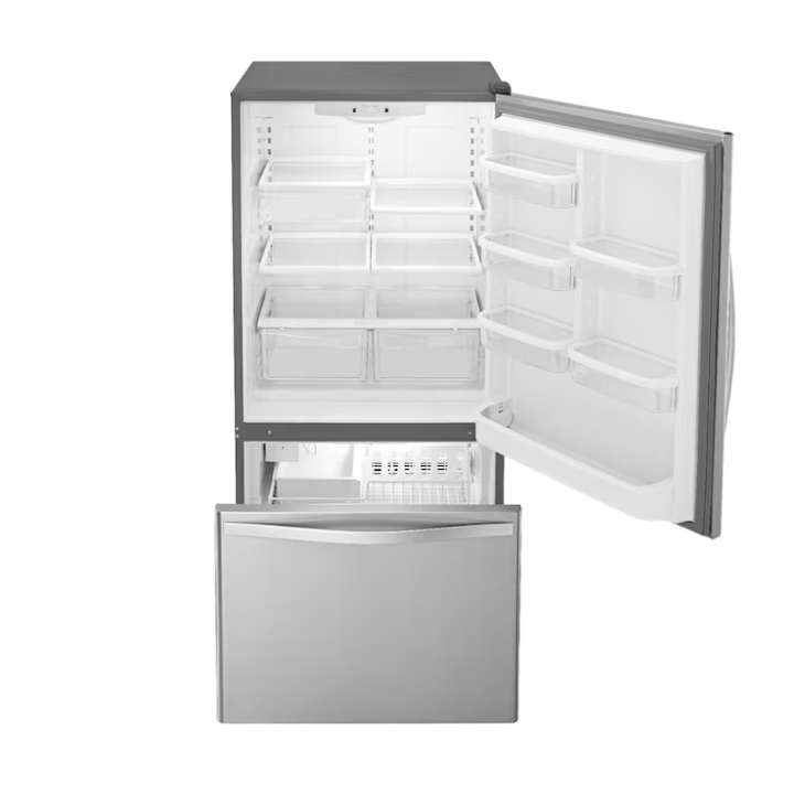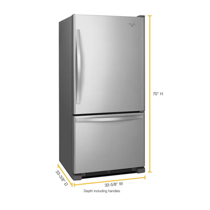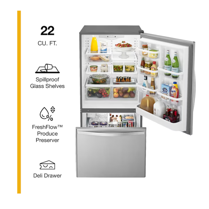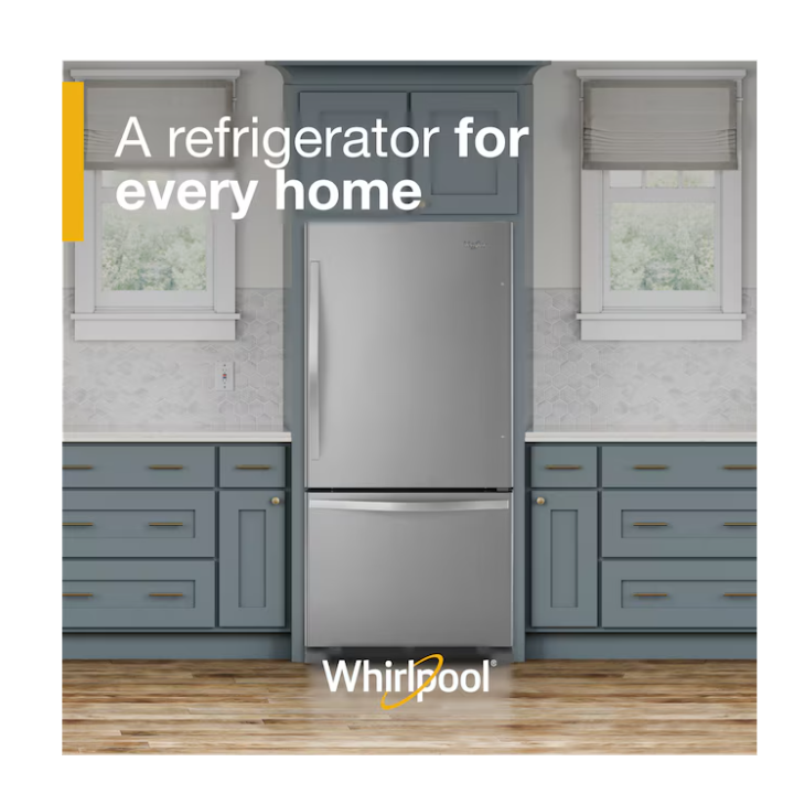 Conveniently store your family’s essentials. This Whirlpool® Bottom-Freezer Refrigerator has a 22 cu. ft. capacity and a freezer drawer that keeps frozen items in close reach. Features include a FreshFlow™ Produce Preserver that keeps fruits and vegetables in the ideal environment, an Accu-Chill™ Temperature Management System that cools items quickly and a Factory-Installed Icemaker. This model is ENERGY-STAR® certified.