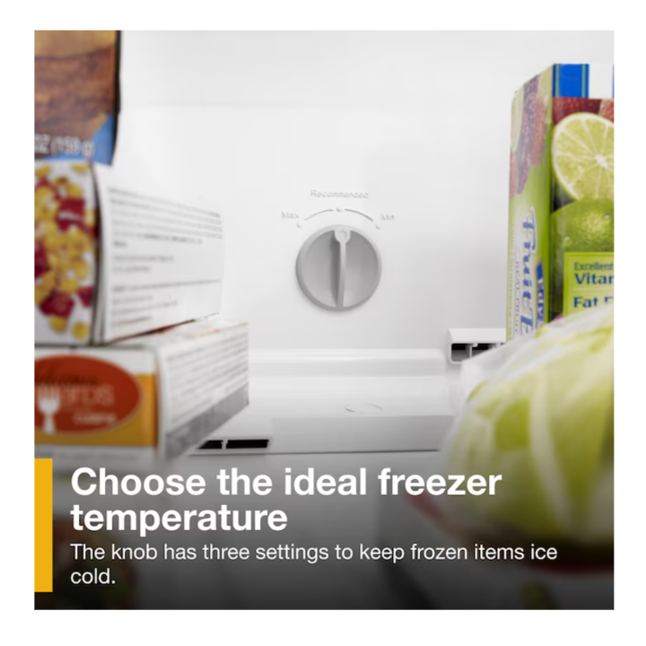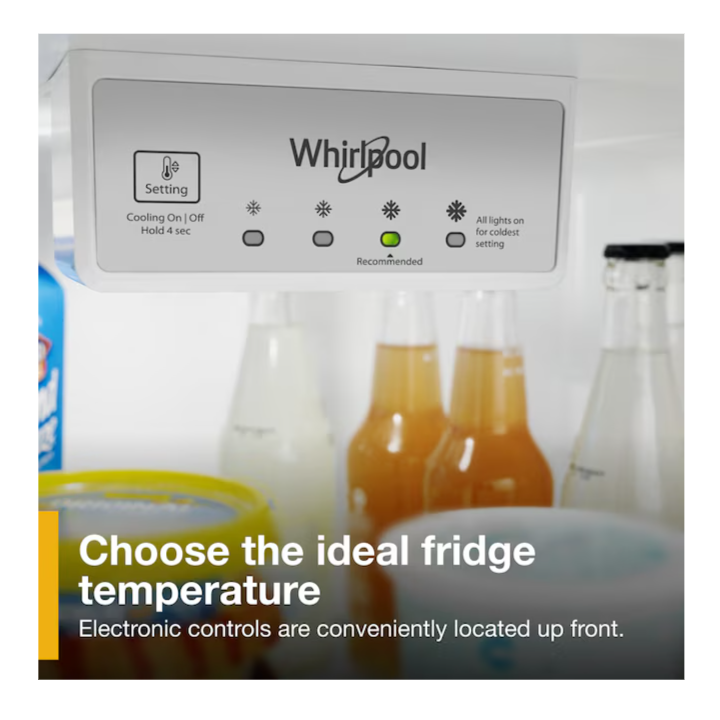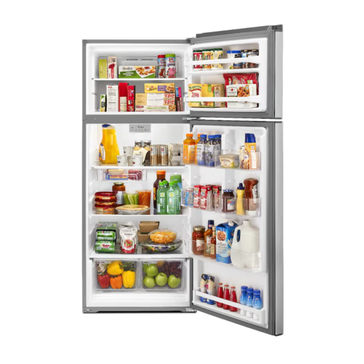 Sleek design, purposeful features. This Whirlpool® 18 cu ft top-freezer refrigerator has a pocket handle that gives it a seamless appearance. The thoughtful design extends to the interior as well, with a family-friendly capacity and storage features like a Flexi Slide-Bin™ that moves to accommodate larger items, and side door bins that make it easy to store (and find) beverages and condiments.